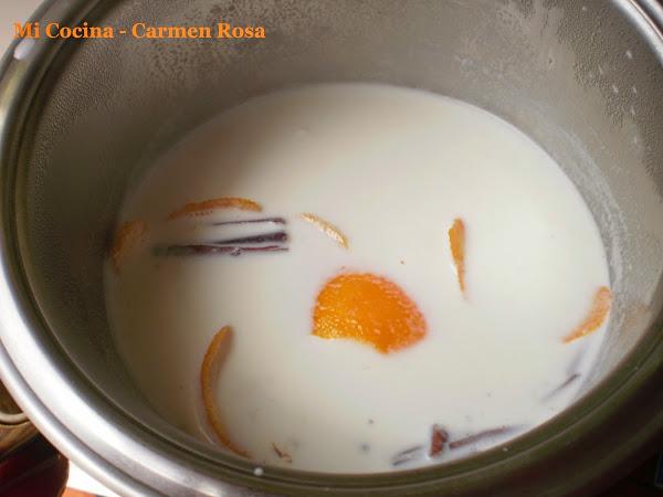 En una cacerola calentar la leche junto con la rama de canela y la piel de la naranja. Cuando hierva, retirar del fuego y dejar infusionar. Pasado unos minutos, retirar la canela y la piel de naranja.