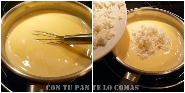 4. En un plato desmenuzamos el requesón y lo añadimos a las natillas poco a poco hasta integrarlo todo y se forme una mezcla espesita.