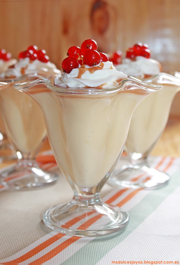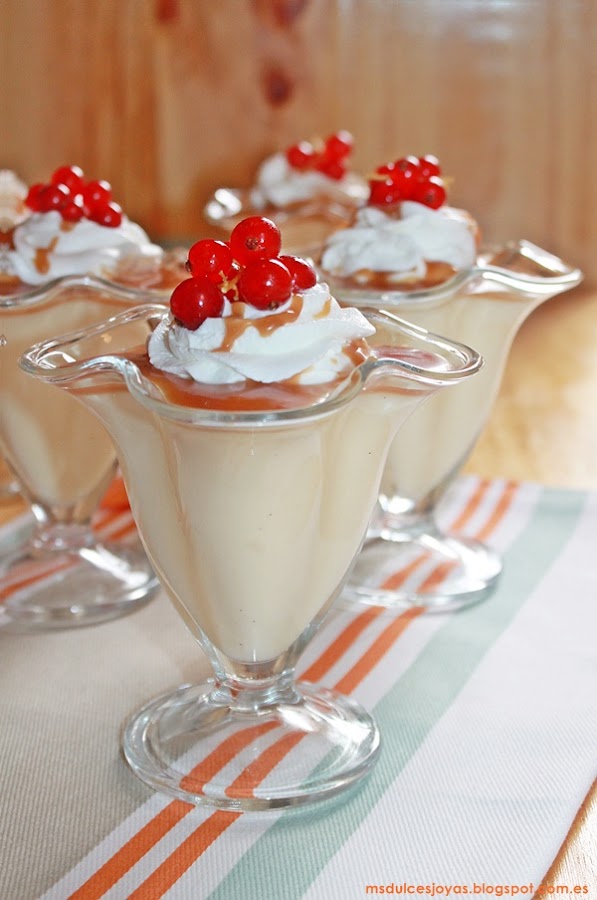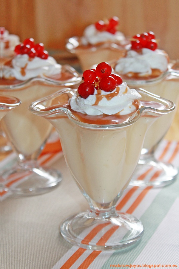 Como la semana pasada hice la tarta Pavlova y también unos macarons (que ya os traeré la semana que viene), me sobraron varias yemas, pues para aprovecharlas hice estas natillas. Para darle un poco de gracia las presenté con salsa de toffee, nata montada (crema de leche) y unas grosellas. Y la verdad quedaron de lo más monas, incluso diría que dignas de cualquier mesa festiva, ¿o no?