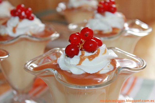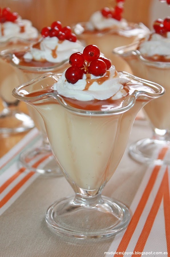 Como la semana pasada hice la tarta Pavlova y también unos macarons (que ya os traeré la semana que viene), me sobraron varias yemas, pues para aprovecharlas hice estas natillas. Para darle un poco de gracia las presenté con salsa de toffee, nata montada (crema de leche) y unas grosellas. Y la verdad quedaron de lo más monas, incluso diría que dignas de cualquier mesa festiva, ¿o no?