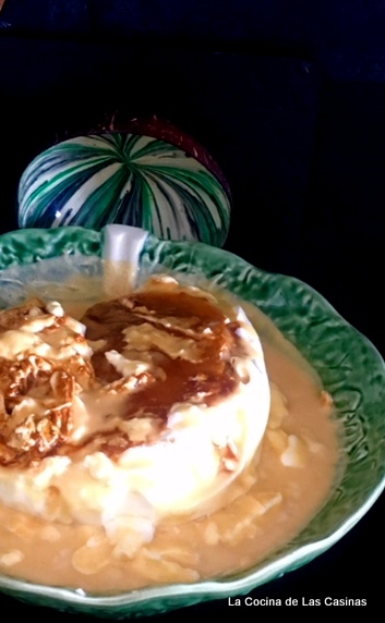 Mueve el cazo intentando que la Isla de Merengue se impregne del caramelo. Retira al bol donde vas a servir las Natillas.
