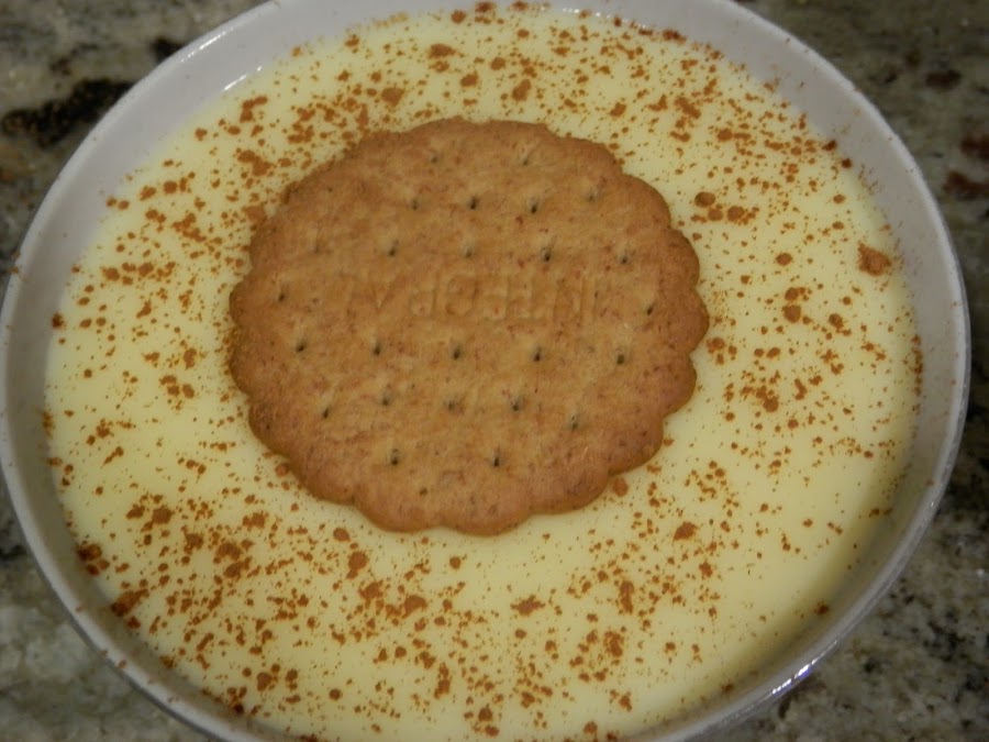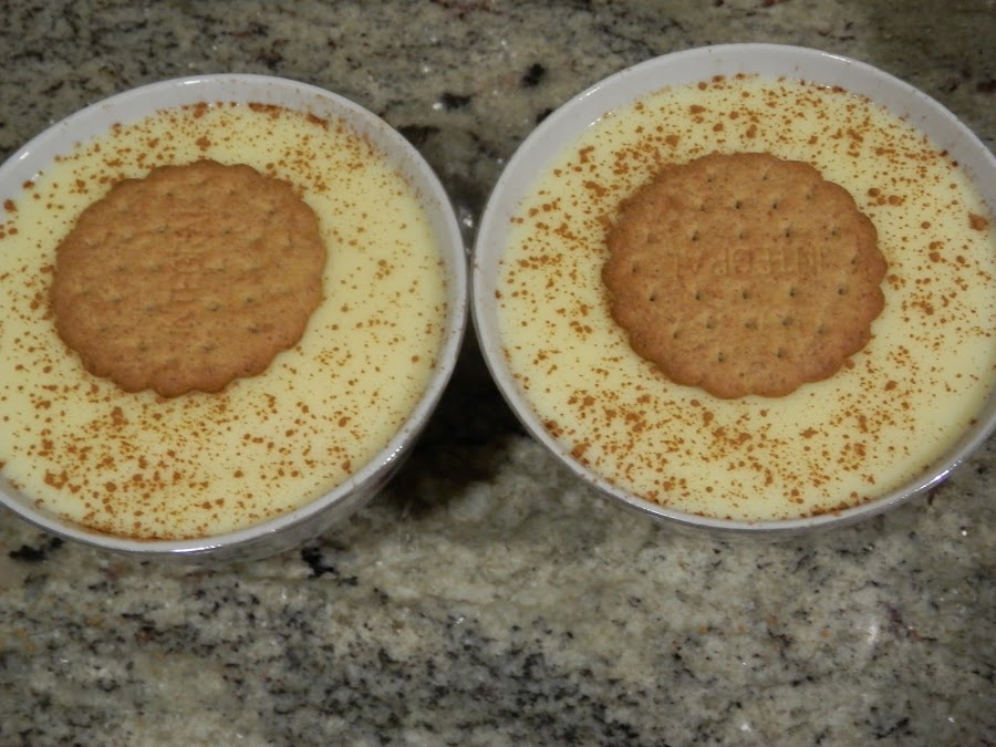 Con cuidado, pon en cada cuenco y encima de las natillas, una galleta y espolvorea con canela molida.