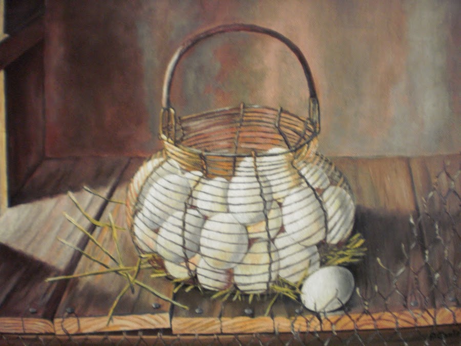 Para acompañar tan rico y casero postre, que en ésta ocasión vestí de “gala” el tarrito de cristal donde lo serví en “Mi cocina”, nada mejor que un realista cuadro pintado por mi suegro “La huevera”, de donde casi se pueden coger los huevos para preparar las natillas ¿no creen?