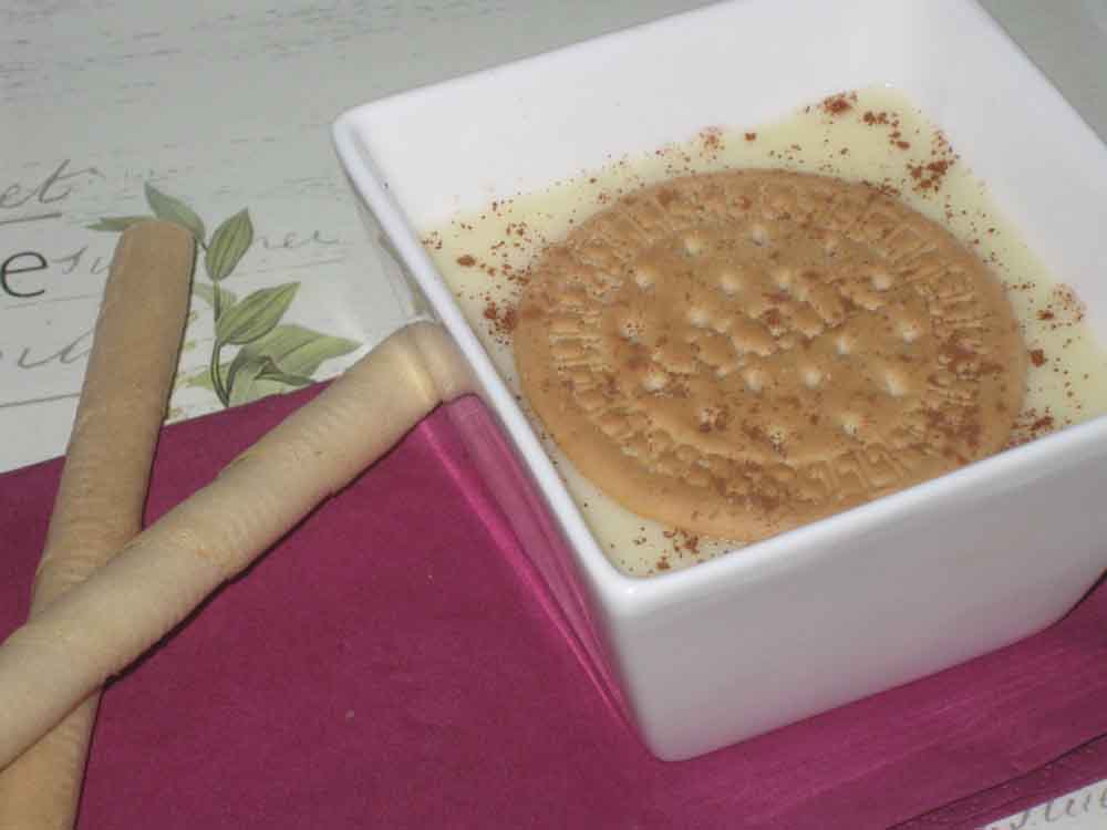 Vaciar el contenido en los recipientes inmediatamente, ya que cuaja muy rápido y decorar con una galleta y un poquito de canela en polvo.