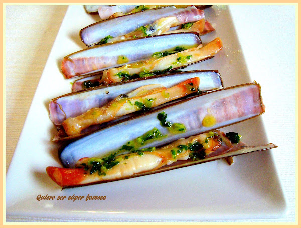 Un par de horas antes de empezar a cocinar, lavar las navajas bajo el grifo del agua. Colocar en un recipiente no demasiado hondo con un puñado de sal. Cubrir con agua mineral y reservar en la nevera.