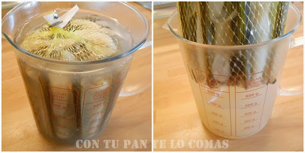 1. Necesitas una jarra o cualquier recipiente alto donde quepan las navajas y las puedas cubrir con agua y un poco de sal. Déjalas por lo menos dos horas y luego sácalas para tirar el agua con la arena. Vuelve a ponerlas otro rato más con agua limpia y vuelve a hacer la misma operación las veces que puedas. Por último las sacas de la red y las lavas debajo del grifo para quitar arena si todavía queda (lo que se pueda).