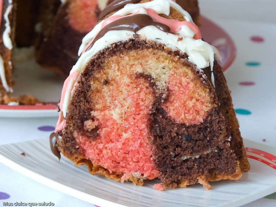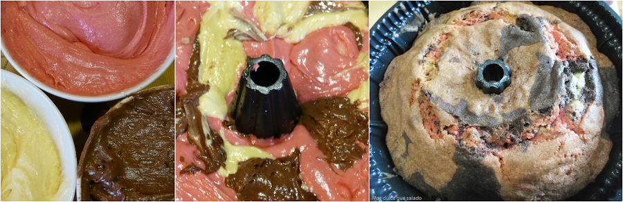 En un lado del molde ir añadiendo con la ayuda de una cuchara, capas alternas de masa normal, masa de chocolate, masa rosa...