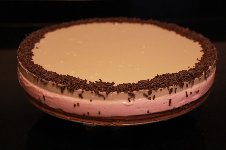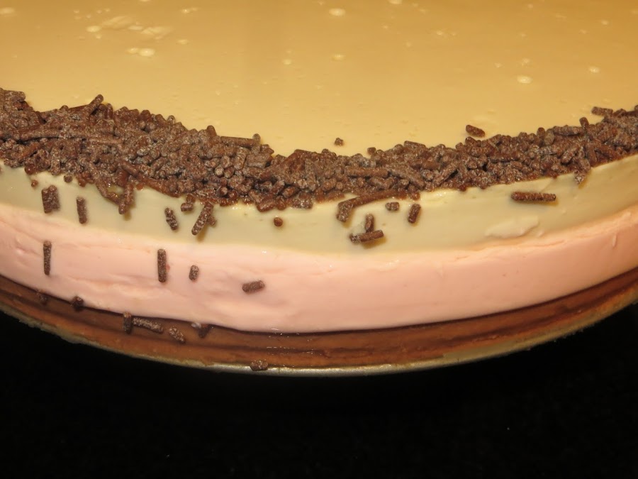 Deshacemos el tercer sobre de cuajada, echamos todos los ingredientes en un cazo y cuando empiece a hervir, retiramos y lo ponemos encima de las otras dos capas. Lo dejamos en la nevera hasta el día siguiente. Antes de desmoldar adornamos con fideos de chocolate y ya está lista para servir.