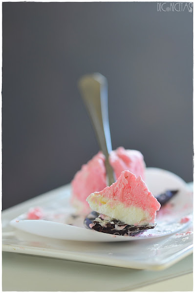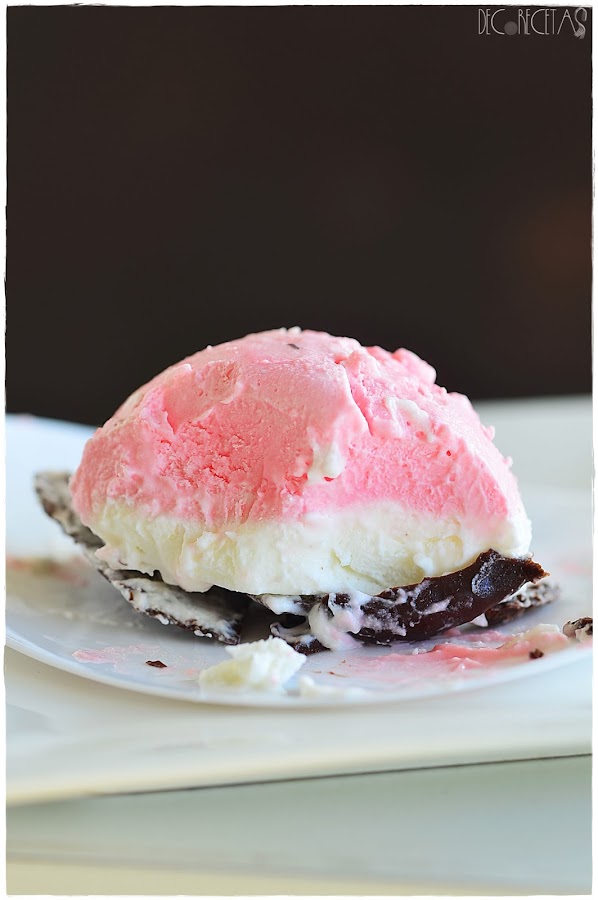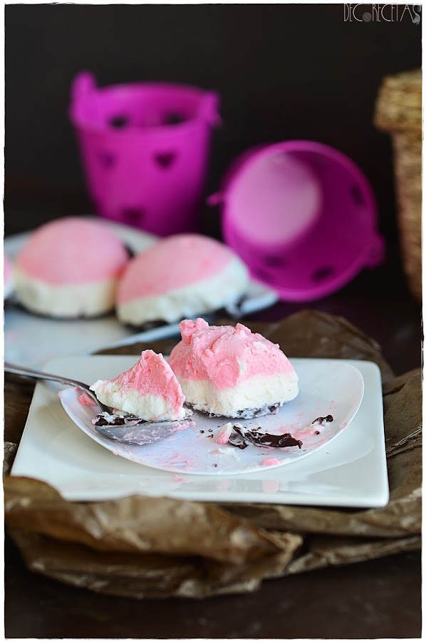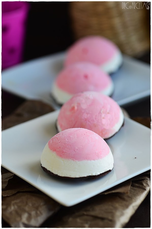 Separamos la nata (crema de leche) en dos recipientes a partes iguales y a uno de ellos le añadimos esencia de vainilla, y al otro esencia de fresa y colorante rosa teniendo los dos sabores característicos. Metemos en dos mangas pasteleras diferentes, y empezamos a rellenar los moldes elegidos, (en mi caso semiesferas) primero con la capa de fresa y después de vainilla. Meteremos al congelador de un día para otro.