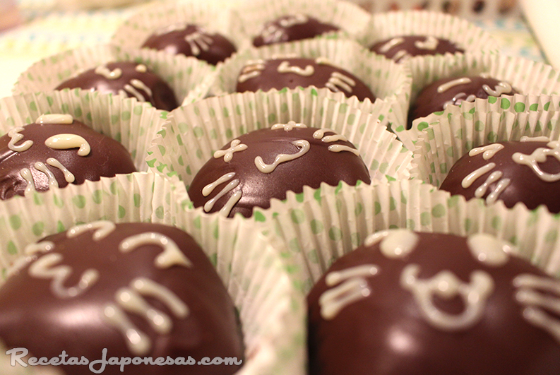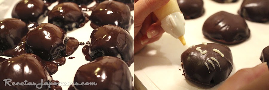Nota: Puedes intercambiar los colores de chocolate, por ejemplo, blanco para cubrir los mochis y hacer los detalles con chocolate negro, adecuando siempre las cantidades.