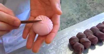 5. Ayudándote con un palito haz 5 surcos en los laterales de cada nerikiri para que adquiera forma de flor de sakura. Hunde el centro o pon una bolita de azúcar pequeña amarilla o blanca de decoración.