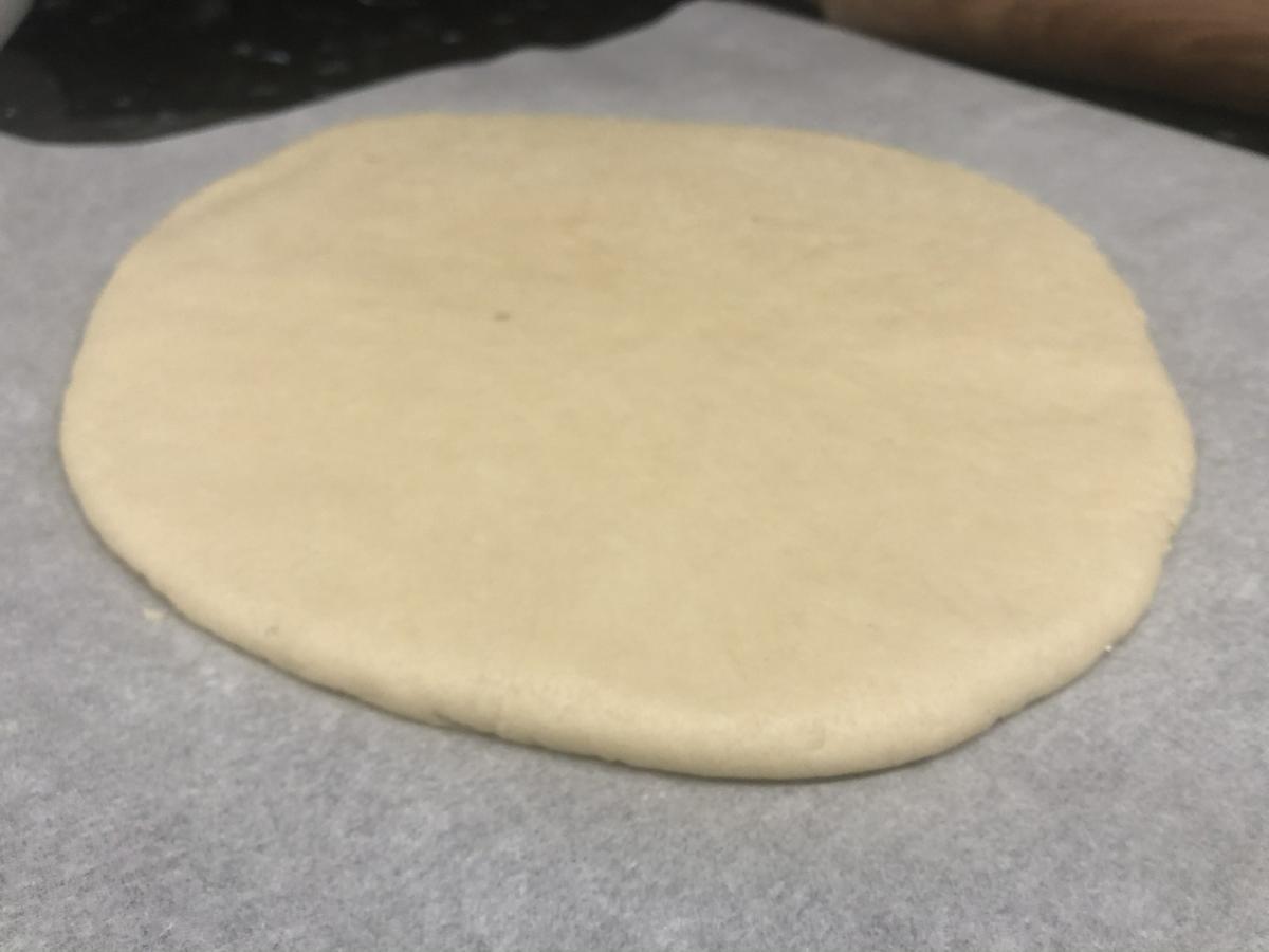 5. Ponemos en la encimera una hoja de papel de horno, la masa encima, y sobre ella, otra hoja de papel de horno. Estiramos con el rodillo hasta obtener una lámina de 1,5cm aprox. de grosor.
