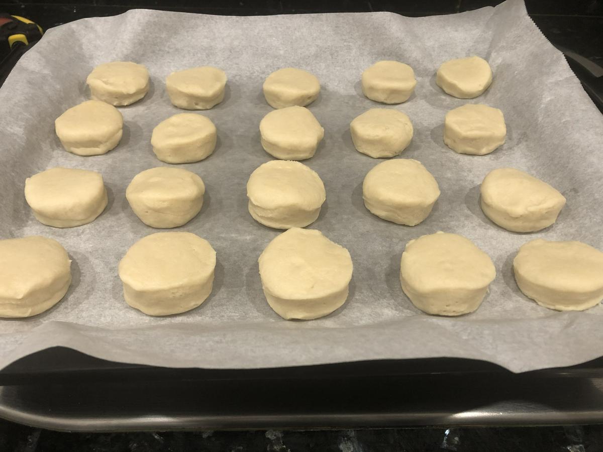 6. Retiramos el papel superior, y con un cortapastas redondo, vamos cortando los nevaditos. Despegamos de la hoja con una espátula rígida y los vamos colocando sobre una bandeja de horno forrada con papel de hornear.