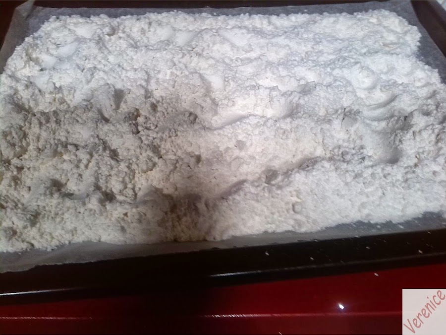 Ponemos papel vegetal en una bandeja para horno y extendemos la harina para que se tueste, moviendo cada diez minutos para que no se queme, en total 30 minutos