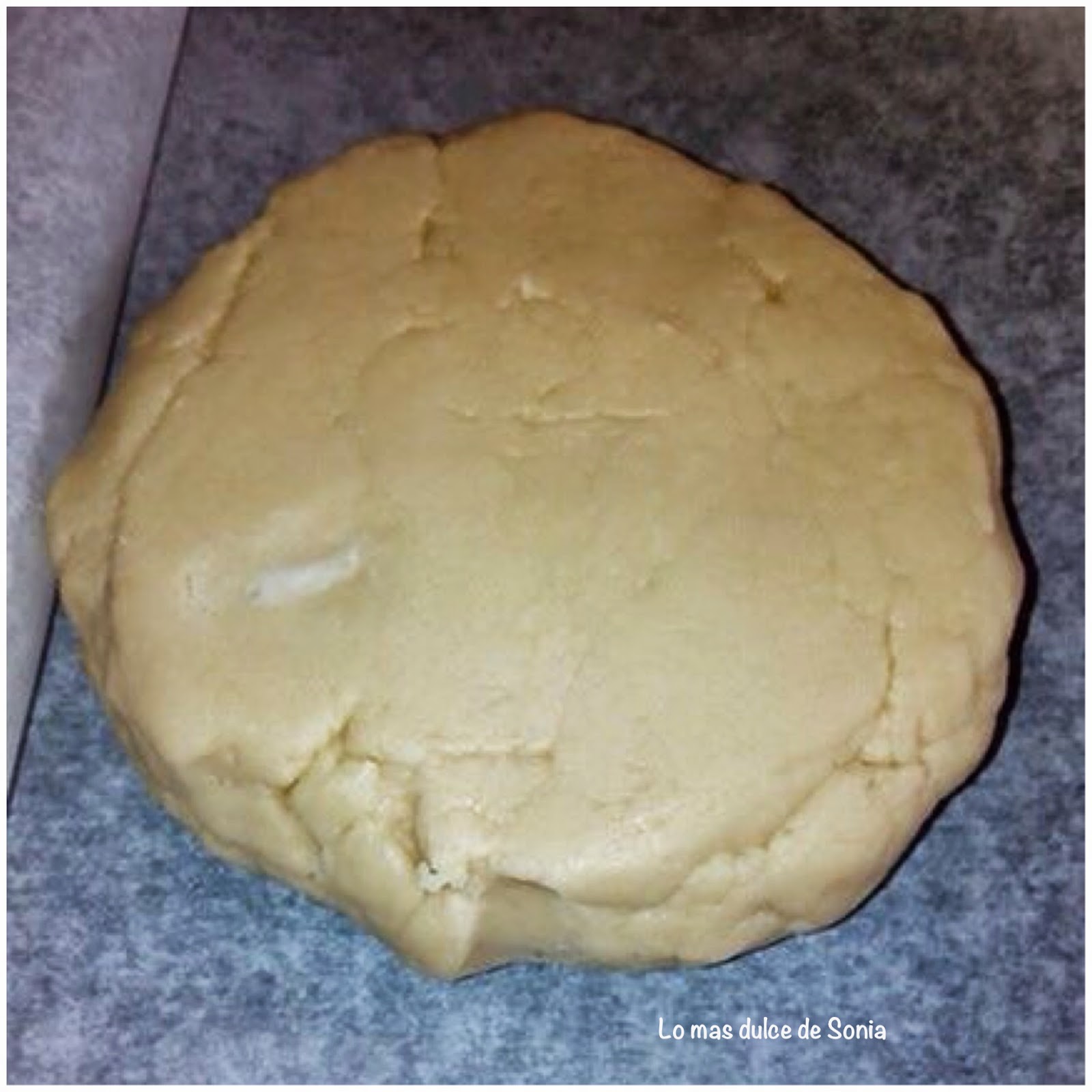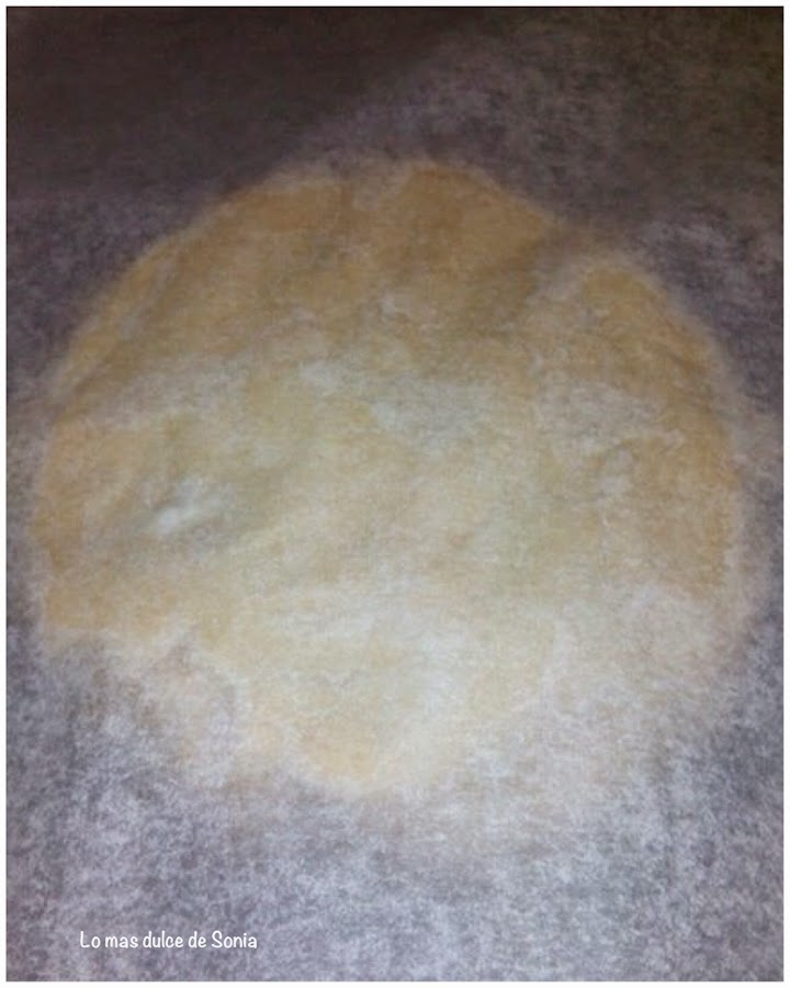 Cogemos dos papeles de hornear, ponemos la masa entra papel y papel y estiramos la masa, pasando el rodillo, tiene que quedar con un poco grosor, un centímetro por lo menos.