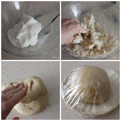 La sacamos del bol y la ponemos en la mesa de trabajo, y amasamos con las manos hasta formar una masa blanda pero que no se peque en las manos.