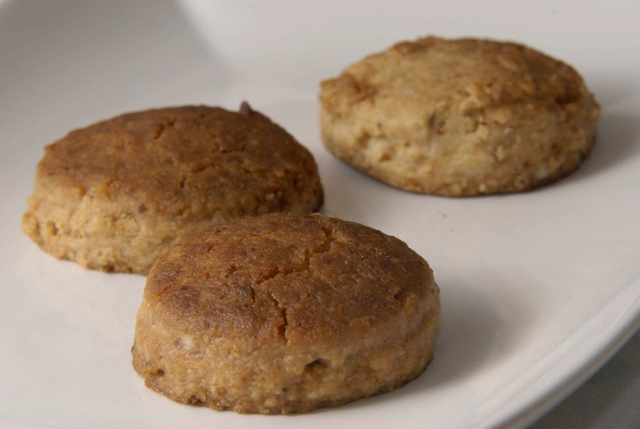 Extender la masa con un rodillo hasta que tenga un grosor de 1,5cm. Cortar en redondos con un cortapastas y hornear a 180º (con el horno precalentado) durante 20 minutos.
