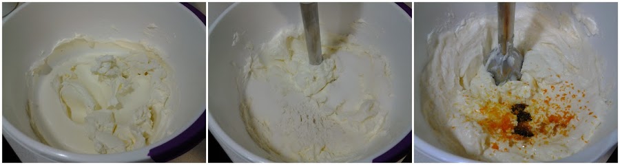 Una vez se haya horneado la base, bajamos la temperatura del horno a 180º. Ponemos en un bol el queso y lo batimos un poco, añadimos el azúcar, la harina y mezclamos bien y a continuación incorporamos la ralladura de limón, de naranja y la vainilla.