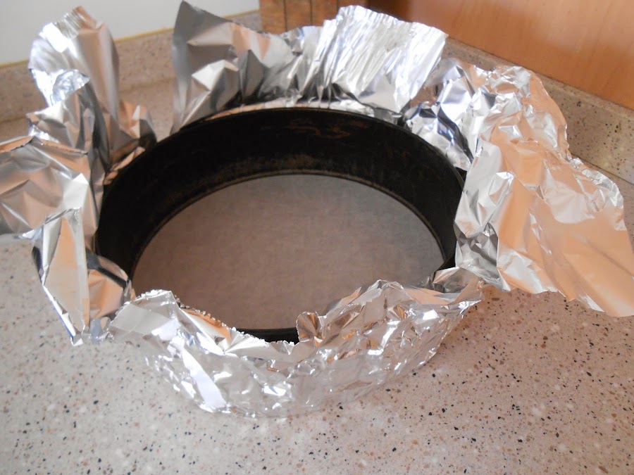 Lo ponemos 10 minutos al horno y lo dejamos enfriar. Cubrimos el exterior del molde con papel de plata.