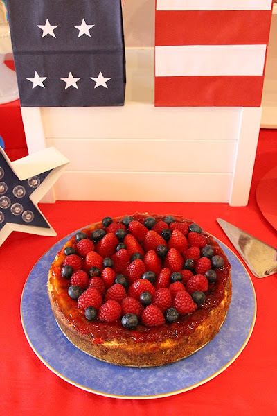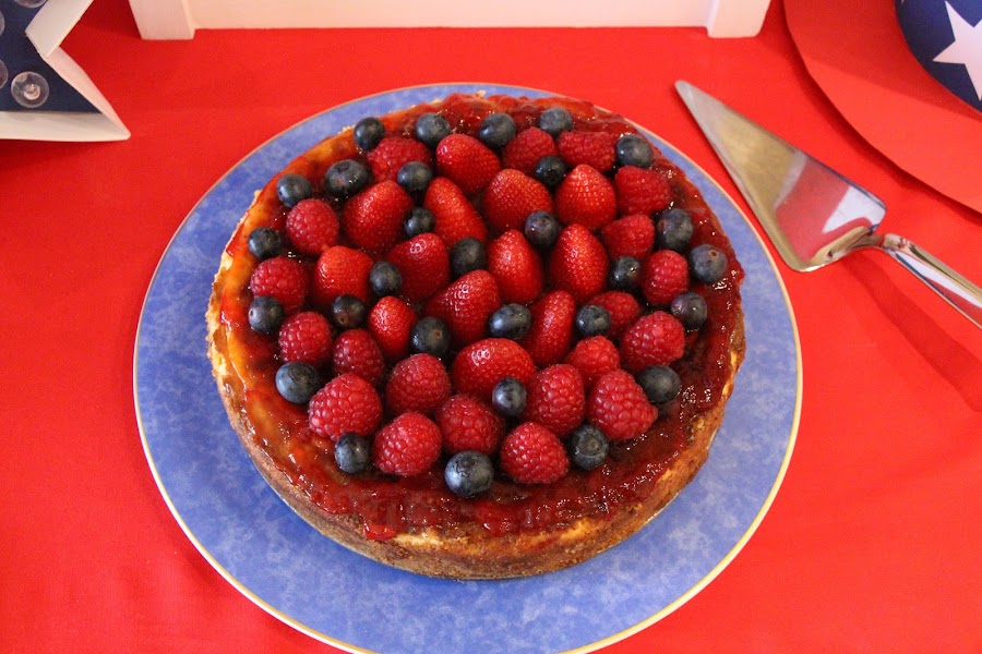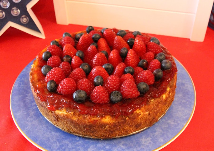Como lo mejor es preparar la tarta de un día para otro, y además a mí me va mucho mejor, horneé el cheesecake por la noche, y una vez frío lo puse en la nevera toda la noche y al día siguiente lo decoré con la mermelada y frutos rojos.
