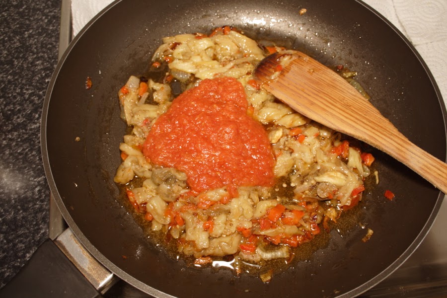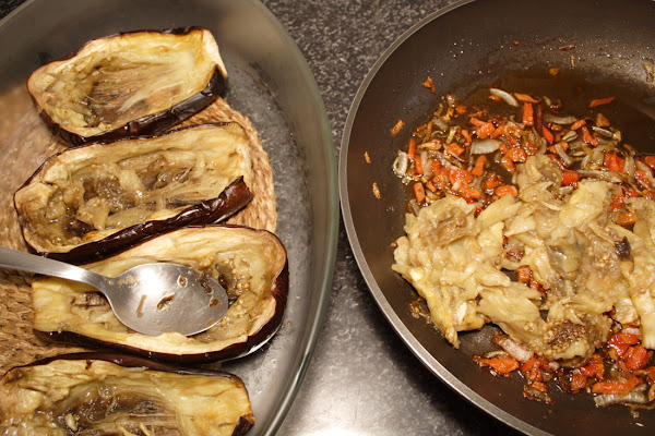 Pasados los 35 minutos, sacamos las berenjenas del horno y con ayuda de una cuchara, las vamos vaciando, echando la pulpa en la sartén con el resto de ingredientes. Ponemos todo al fuego y dejamos que se hagan unos minutos. Echamos la salsa de tomate, removemos y retiramos del fuego.