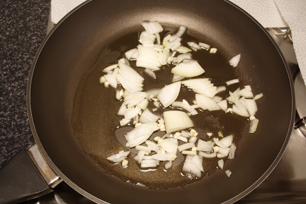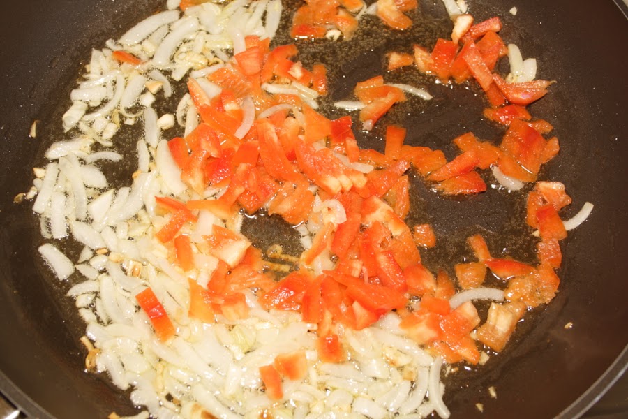Mientras ponemos al fuego una sartén grande con aceite de oliva y echamos a pochar la cebolla y el ajo, cuando estén, añadimos el pimiento, esperamos a que este blando, retiramos del fuego y reservamos.