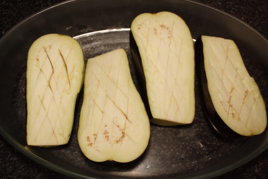 Lavamos y cortamos por la mitad, a lo largo las berenjenas, les damos unos cortes y las ponemos en una fuente de horno, sazonamos y metemos en el horno durante unos 35 minutos.