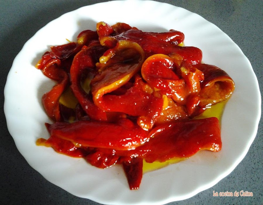 Asar los pimientos en el horno, pelarlos y cortarlos en tiras, le ponemos un poco de aceite virgen extra y un poquito de sal.