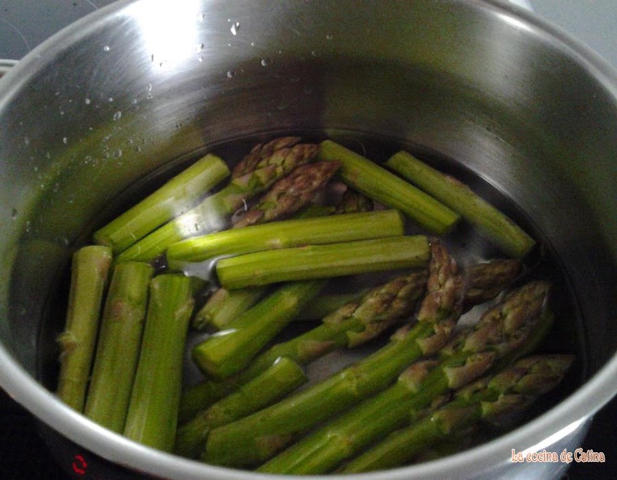 Poner agua con sal en un cazo a hervir y añadir los espárragos durante 5 minutos.