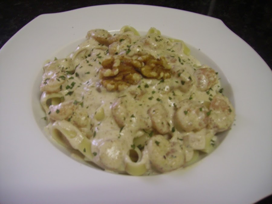 Mientras hemos estado preparando la salsa, los nidos ya están cocidos, escurrimos y los añadimos a la sartén, mezclamos bien para que se impregne bien de la salsa de nueces y ya lo tenemos listo para comer.