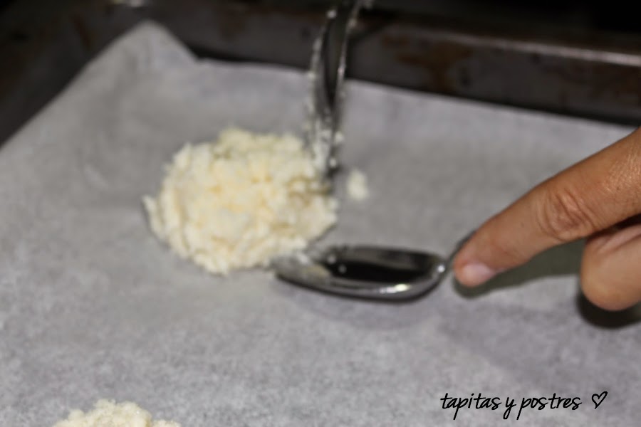Precalentamos el horno a 160º y en una bandeja forrada con papel vegetal, hacemos montones con dos cucharas. Dejamos un hueco en el centro y horneamos 15 minutos, hasta que los veamos dorados.