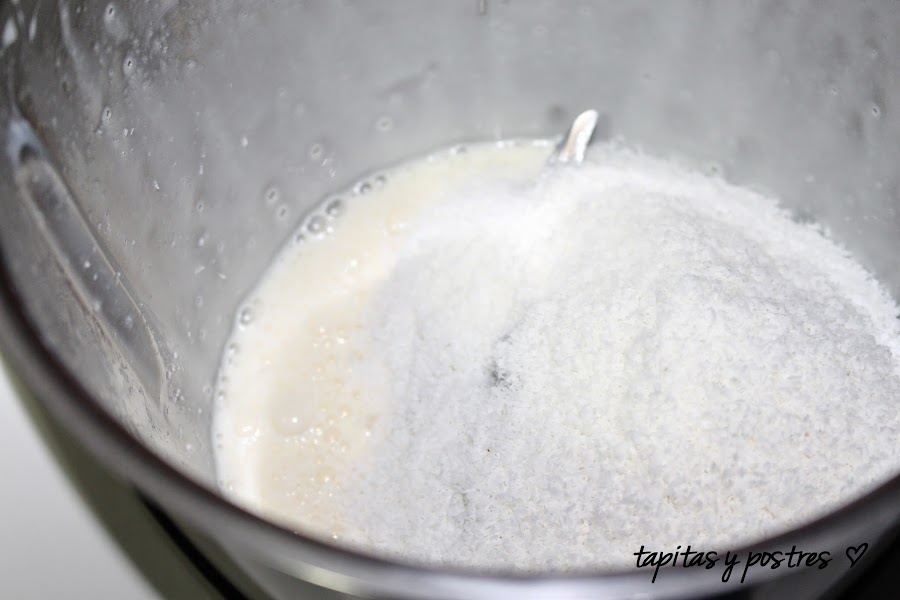 Añadimos el coco y volvemos a mezclar 20 segundos a velocidad 4. Nos quedará una pasta grumosa.