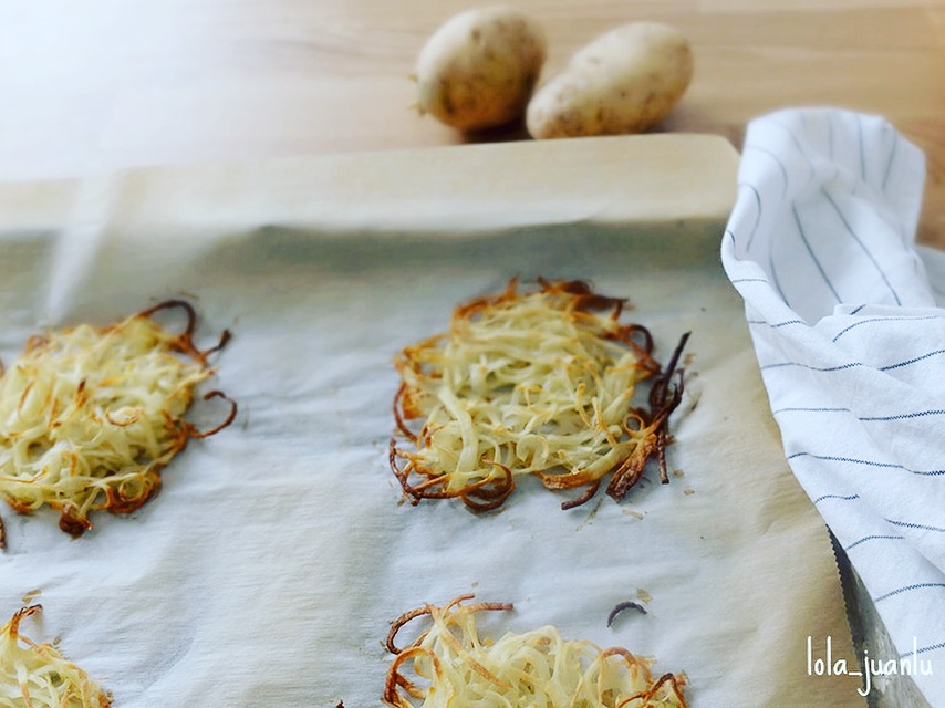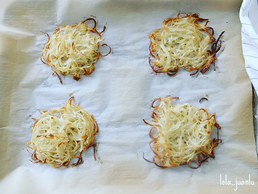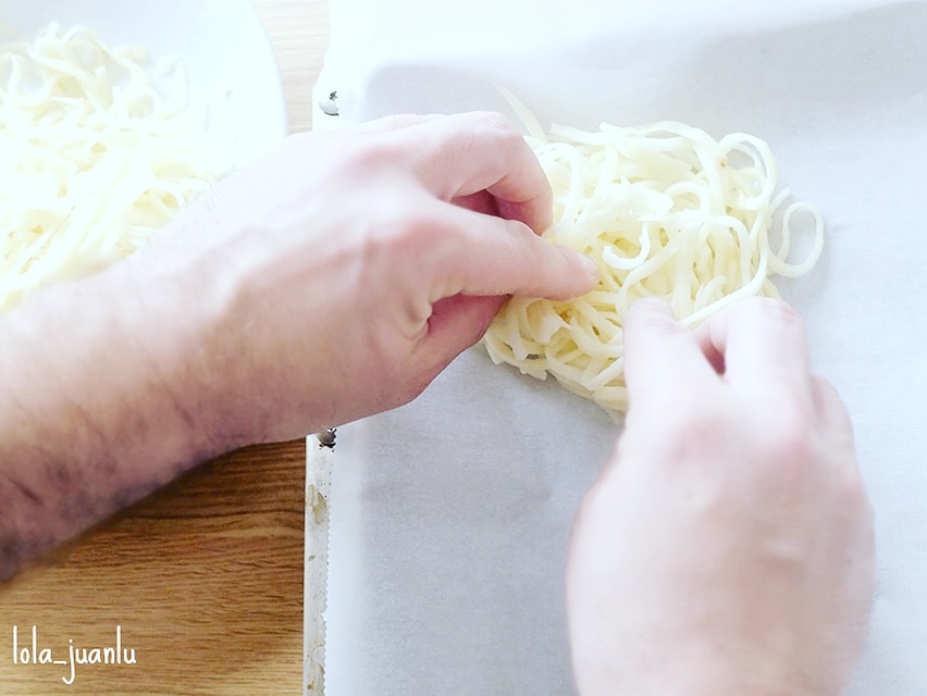 Ponemos papel de horno en una bandeja y sobre él colocamos las virutas de patata formando unos nidos. El almidón de la patata hace de pegamento para que se mantenga todo unido.