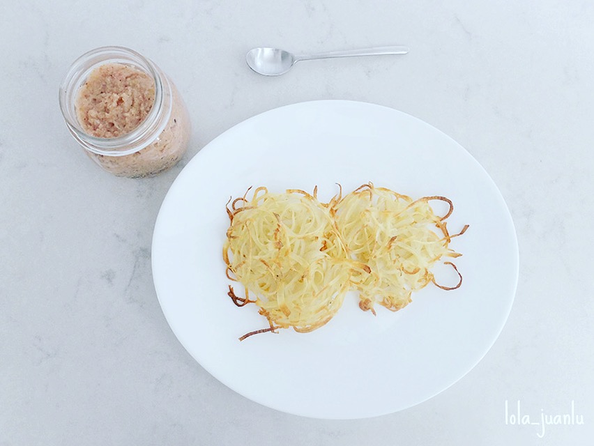 Las podemos acompañar de una confitura de bacon casera. La confitura le aportará el sabor suficiente de manera que no echaremos en falta ni la sal ni la pimienta en los nidos de patata.