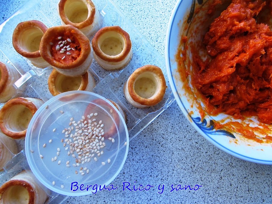 2. Rellenamos todos los volovanes y espolvoreamos con semillas de sésamo.