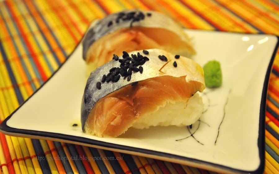 Coloca un poco de wasabi en la parte superior ( como el tamaño de una lenteja pequeña ) y sobre el wasabi un corte de caballa, repite este proceso con todos.