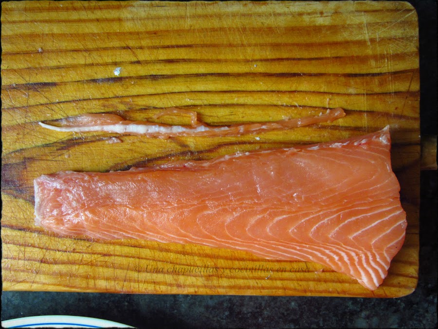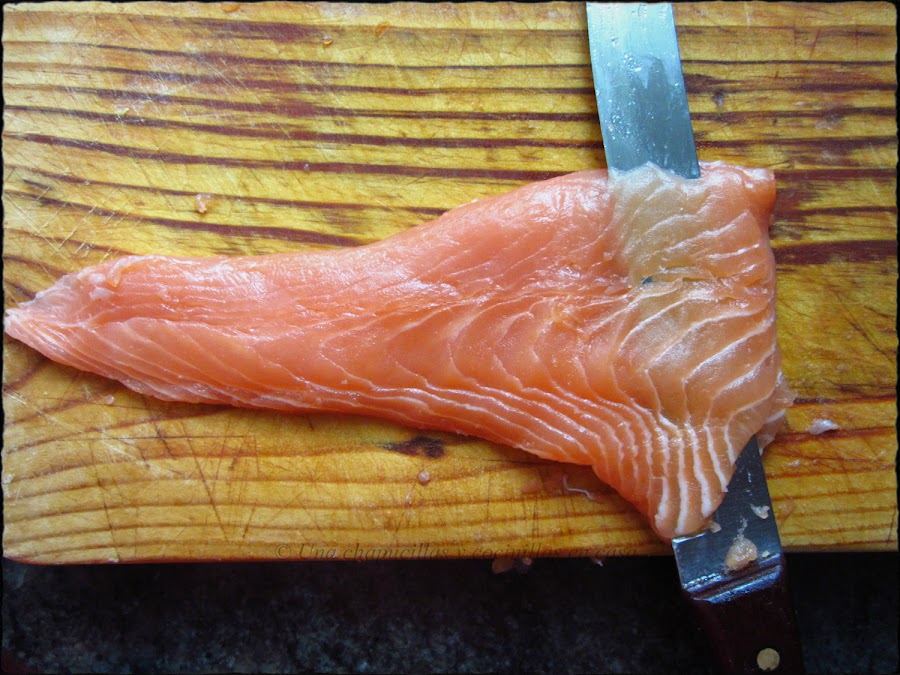 Lo primero quitarle la piel, tocar también el filete por encima por si tuviese alguna espina y quitarla.