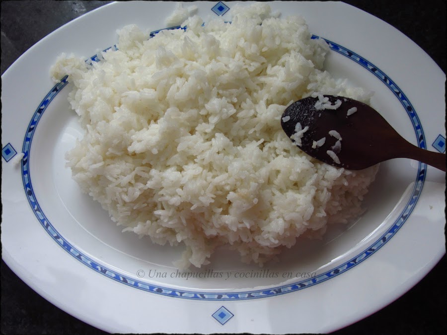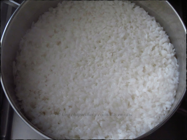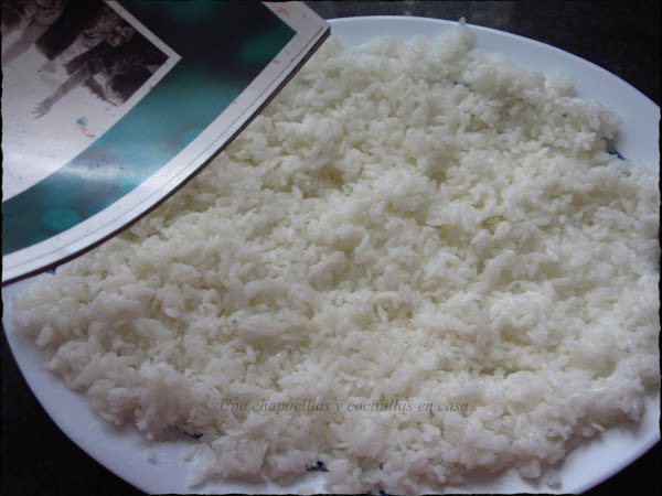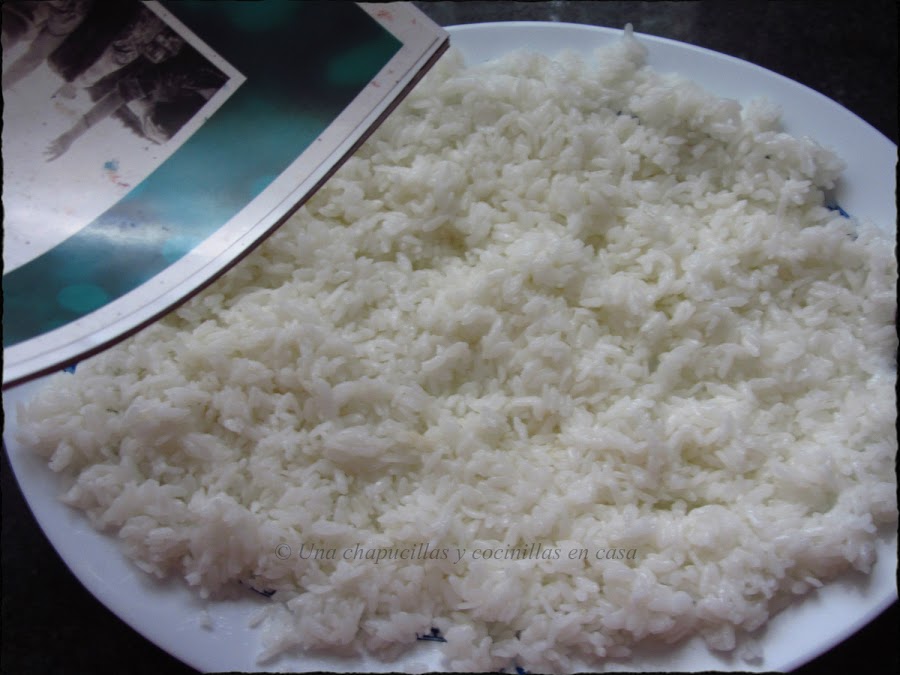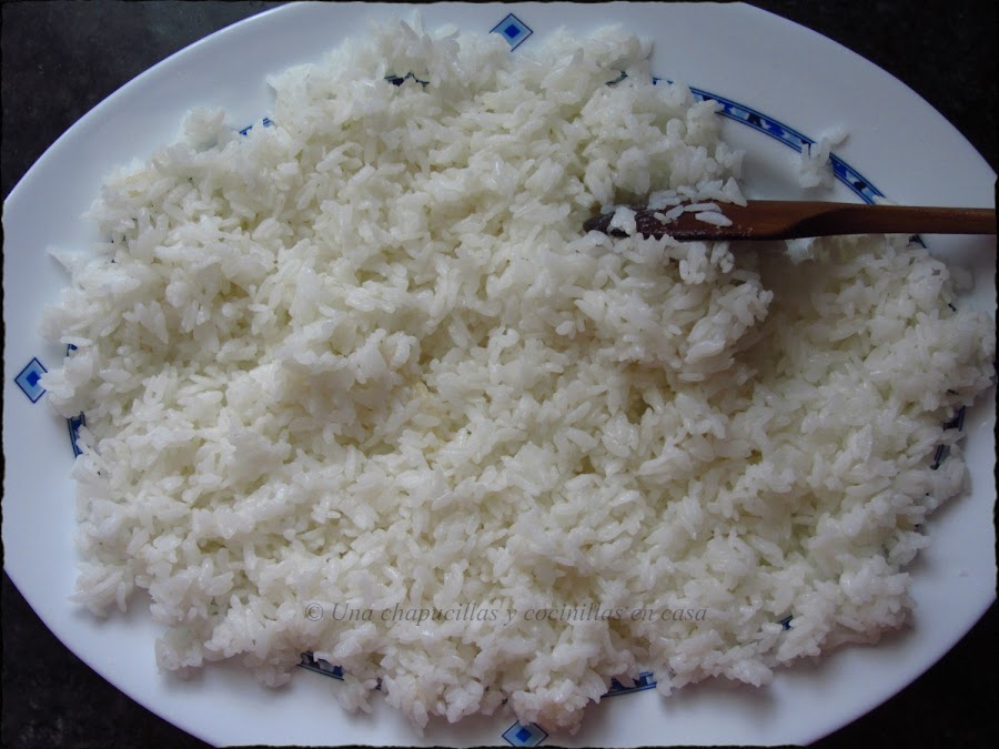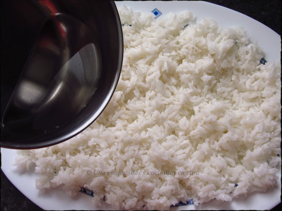 Dejar enfriar el arroz a temperatura ambiente, lo ideal sería dándole con un ventilador, a falta de uno, yo le estuve abanicando, esto hace que se enfríe antes y el arroz quede brillante (^-^)