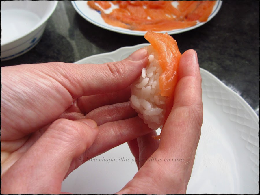 Colocar un trozo de salmón encima y apretar un poco. Ya tenemos nuestro primer nigiri.