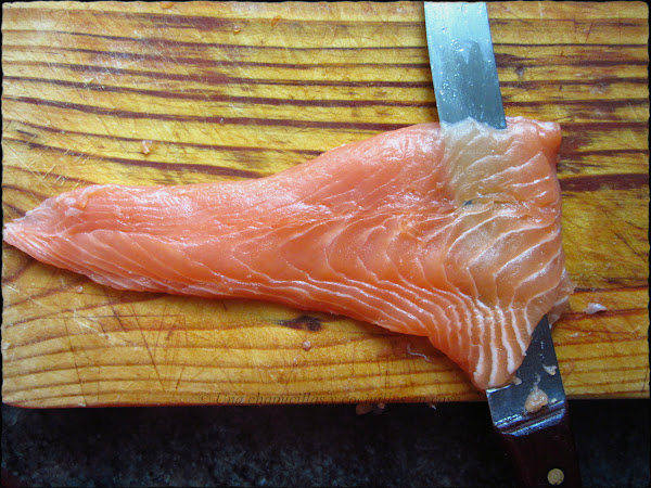 Os explico como siempre con fotos el paso a paso y os pongo también el enlace a un vídeo de un cocinero de sushi para que veáis el corte. Yo os adelanto que con mis cuchillos me fue imposible realizar los cortes como en el video, así que los hice fileteando el pescado en horizontal y luego cortando los trozos, bueno luego lo vereis en la foto.