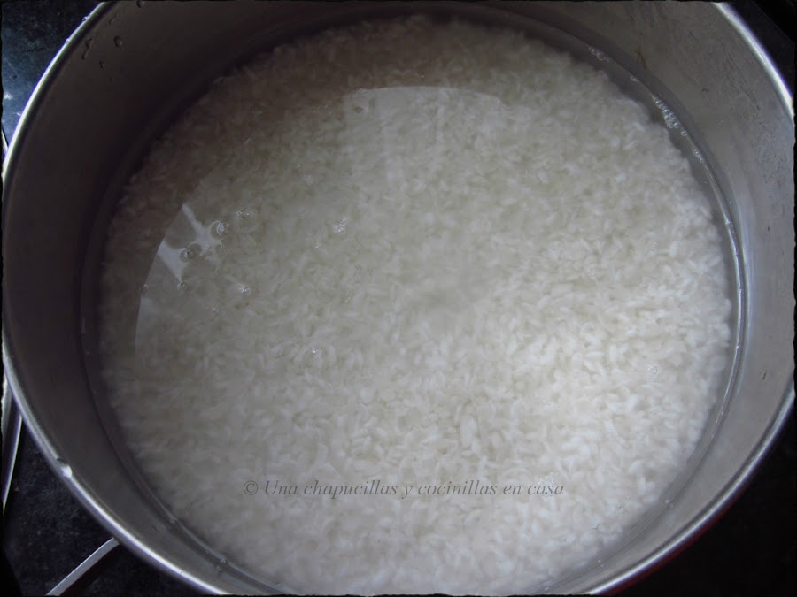 Vamos con el arroz, poner la olla al fuego y llevar a ebullición, Dejar hervir durante 5 minutos hasta que empiecen a salir los típicos pequeños agujeros en la superficie del arroz.