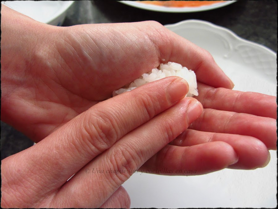 Ahora a preparar los nigirizushis, tener a mano un platillo con agua para ir humedeciendonos las manos con cada nigiri que vayamos haciendo, ya que es un arroz muy pegajoso y evitamos que se nos quede todo pegado y nos impida darle forma.
