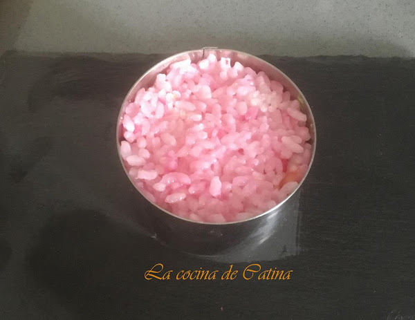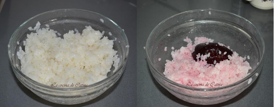 Ponemos la mitad del arroz en otro bol con un trozo de remolacha para que se tiña del color de la remolacha (rosa).