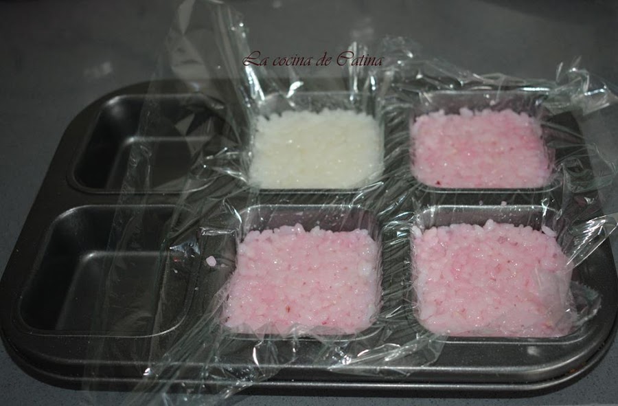 Forramos el molde donde lo vayamos a colocar con papel film, y lo distribuimos en capas de un centímetro y lo dejamos enfriar durante una hora aproximadamente.