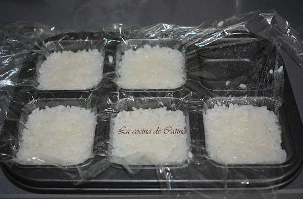 Desmoldamos sobre la bandeja donde lo vayamos a servir vamos preparando los toppings cortando las verduras y el salmón (o lo que vayamos a utilizar) en trozos que quepan encima de los pastelitos de sushi.