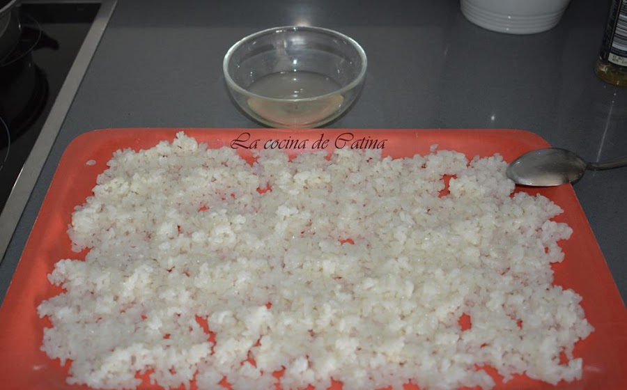 Después de reposar el arroz, lo colocamos extendido en una bandeja amplia y lo dejamos enfriar. Una vez frío, lo pasamos a un bol y añadimos el aderezo y lo mezclamos para que todo el arroz se impregne del aderezo.