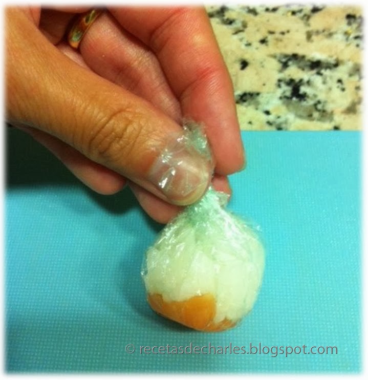 Una vez que el arroz esté a temperatura ambiente podemos empezar a preparar los nigiri sushi. Para las bolitas, cogemos los cuadrados de papel film y colocamos en el centro un trozo de salmón y una cucharada de arroz encima. Juntamos las cuatro esquinas del papel y las enrollamos para formar un saquito y hacer una bola redonda.