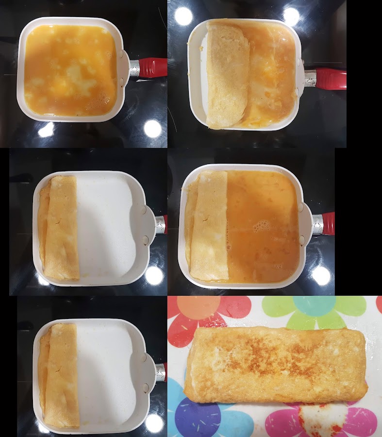 Por último la tortilla japonesa. además de que como habréis visto por los ingredientes se trata de una tortilla dulce, se trata de una tortilla enrollada. Se debe hacer en una sartén pequeña y a ser posible, cuadrada. Esto último no es imprescindible, pero entonces nos sobrarán las puntas redondas.
