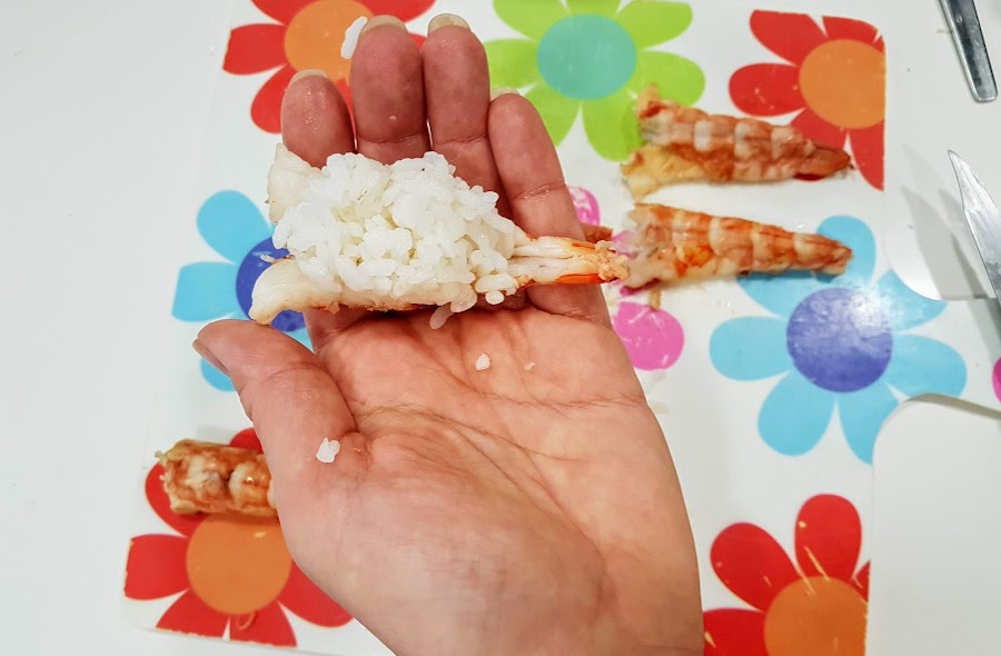 Para los nigiris de gamba y de salmón, untamos un poco de queso sobre el pescado, colocamos encima el niguri, apretamos ligeramente con el dedo índice, le damos la vuelta y terminamos de darle forma.