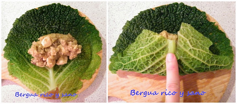 8. Ahora vamos a armar nuestros niños envueltos. Colocamos una hoja boca arriba y con el tallo hacia nosotros. En el centro colocamos un par de cucharadas colmadas de relleno. Doblamos la parte del tallo hacia arriba.